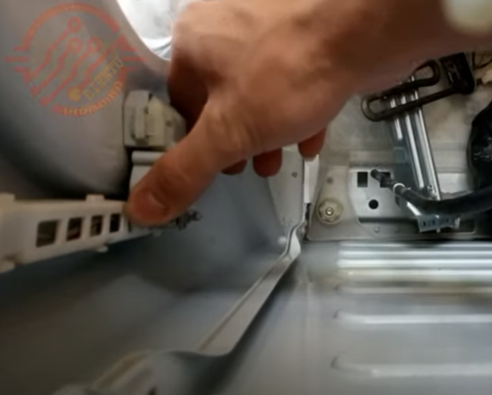 Bước 2 : Nếu đằng trước mặt bạn không có phần tháo nước thải như hình bên trên các bạn cần phải dùng tô vít tháo lắp đạt bên trên máy giặt Electrolux ra nhìn xuống bên dưới thẳng chỗ tay nắm cửa bạn sẽ thấy hình của công tắc cửa.